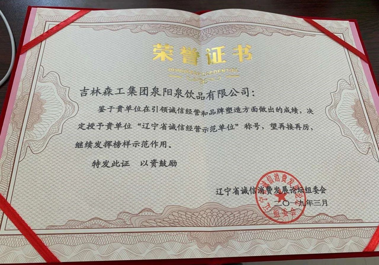 泉陽泉榮獲“遼寧省誠信經營示范單位”榮譽稱號!